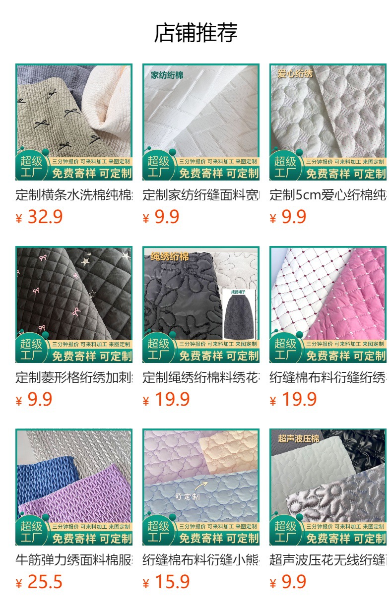 • 定制绳绣绗棉绗缝夹棉包面料衍缝棉布料服装童装家纺布料绗缝加工