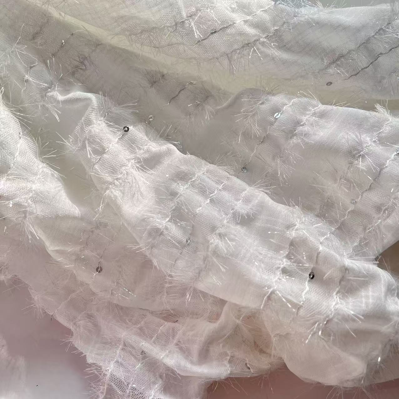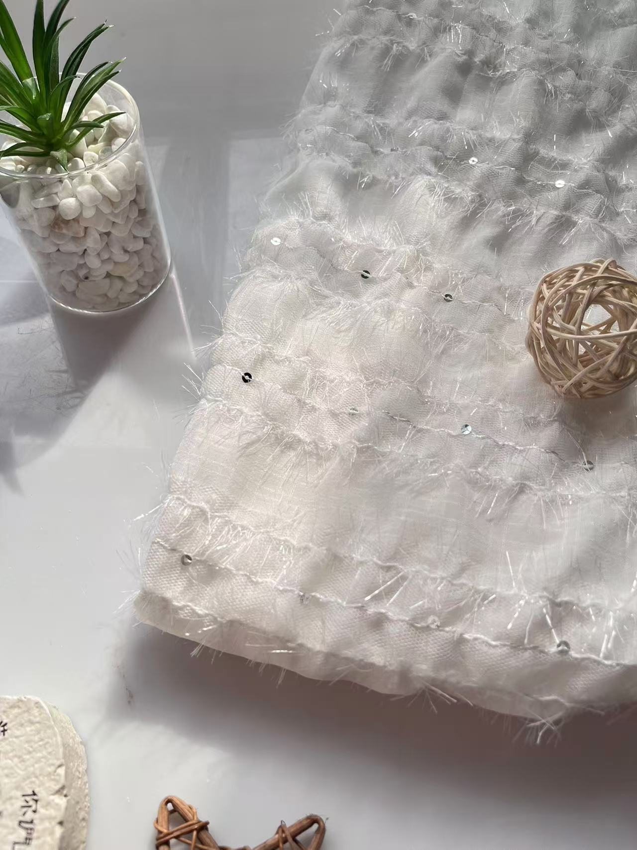 • 纯白色刺绣条纹钉珠片压皱雪纺纱布料服装公主百褶裙长裙窗